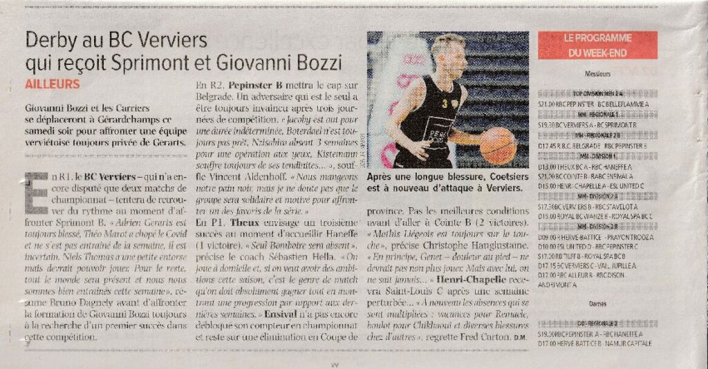 Derby au BC Verviers qui reçoit Sprimont et Giovanni Bozzi