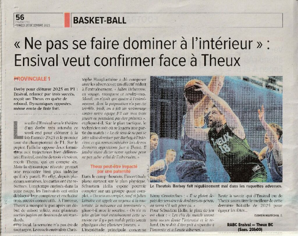 » Ne pas se faire dominer à l’intérieur » : Ensival veut confirmer face à Theux 1 Pro Presse 20 décembre 2025 L’Avenir 20.12