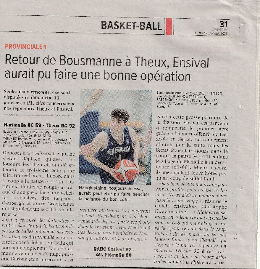 Retour de Bousmanne à Theux, Ensival aurait pu faire une bonne opération 1 Pro Presse 12 janvier 2026 L’Avenir 12.01.26